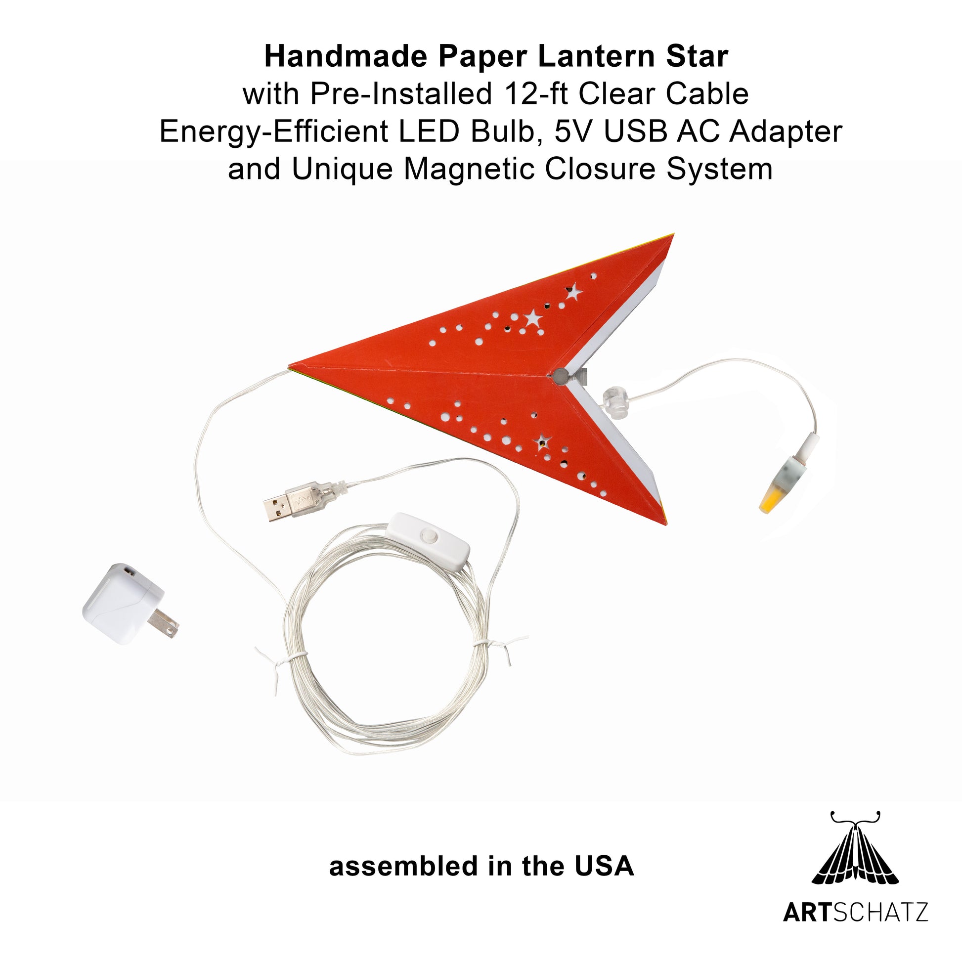Each Star is handmade in India and assembled here in New York, USA. Each star has been checked for quality and comes pre-wired with a clear 12-ft cable with on/off switch, an energy saving LED bulb and a 5V AC adapter.