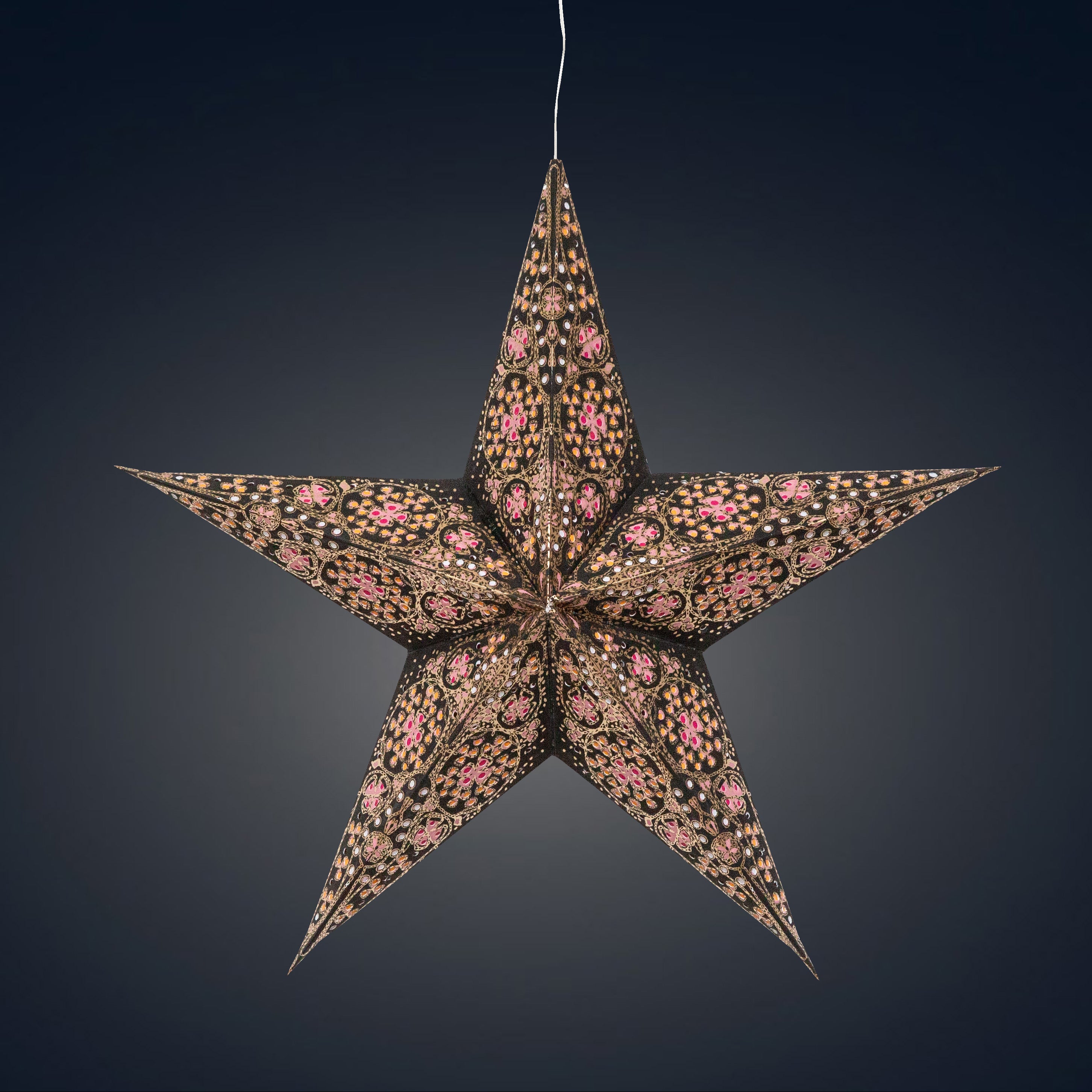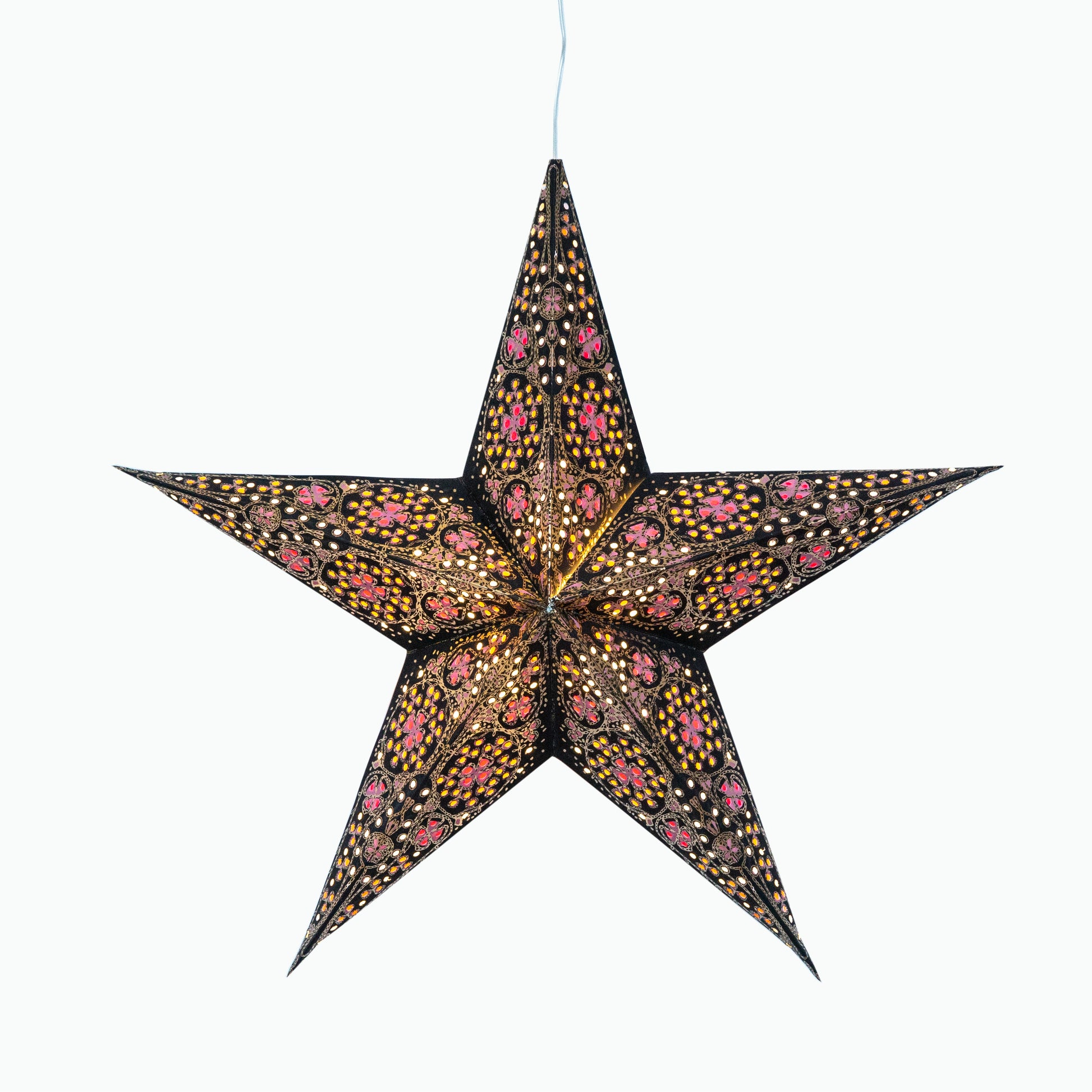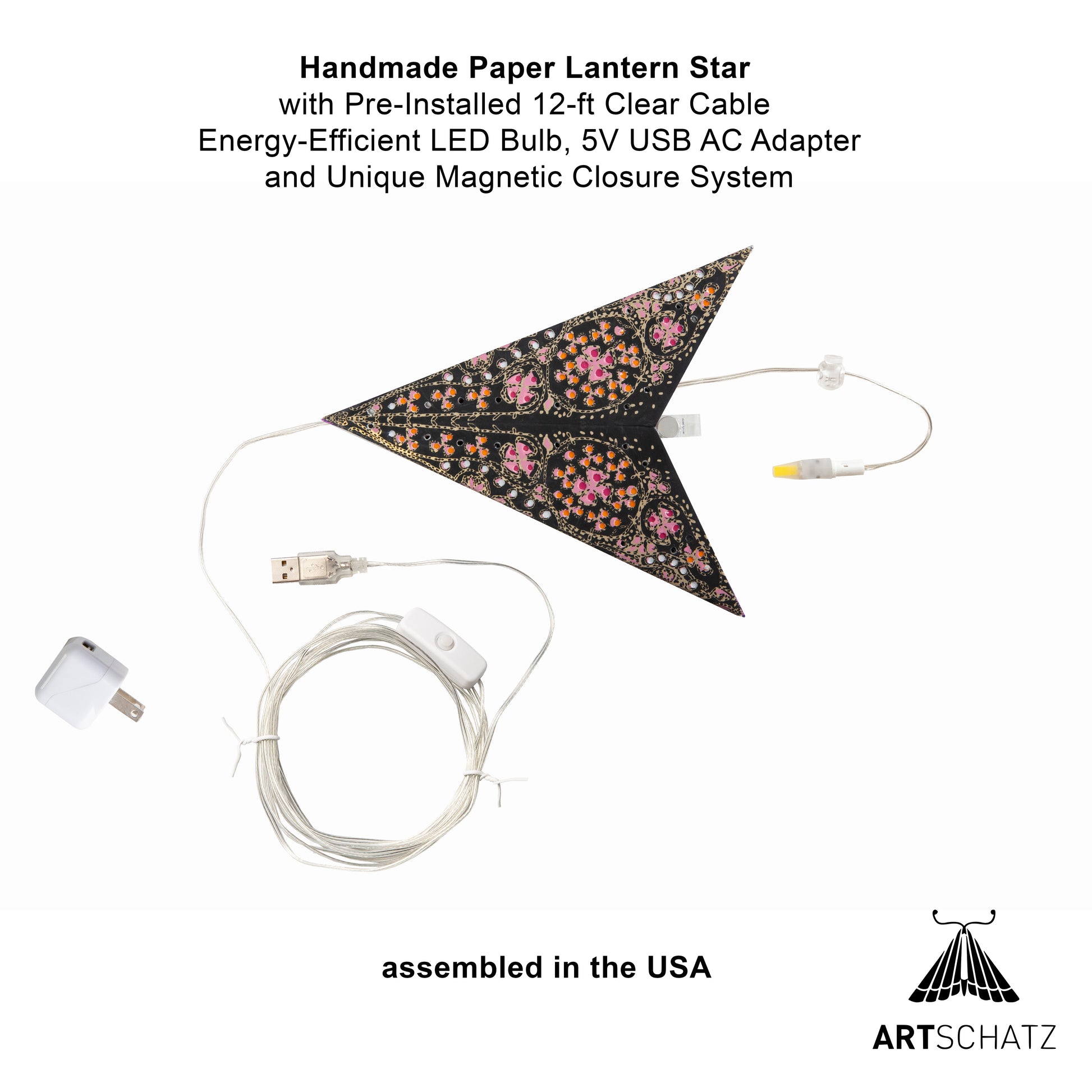 Each Star is handmade in India and assembled here in New York, USA. Each star has been checked for quality and comes pre-wired with a clear 12-ft cable with on/off switch, an energy saving LED bulb and a 5V AC adapter.