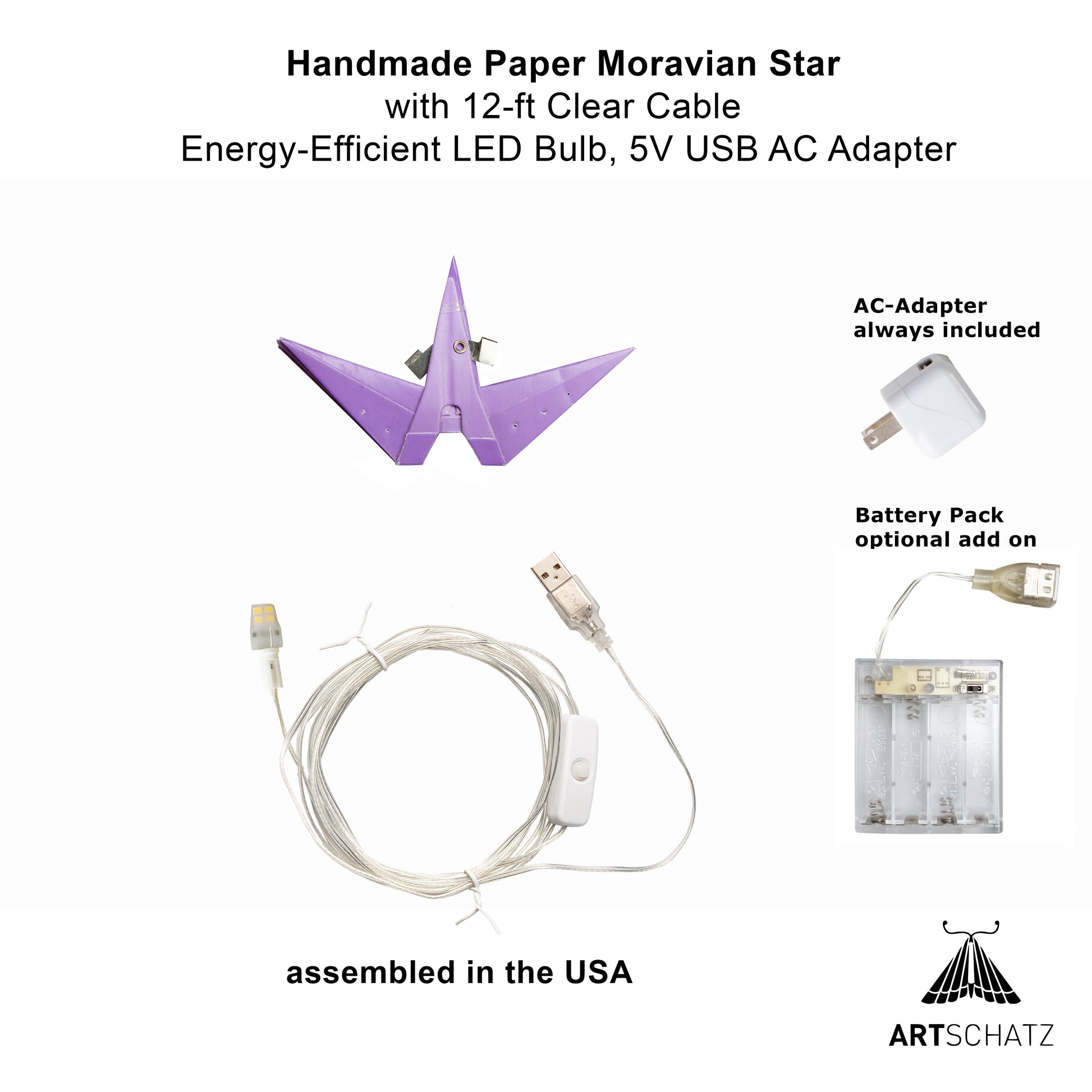 Each handmade Moravian paper star comes with a clear 12-ft cable, an energy saving LED bulb and a 5V AC Adapter, optional as add-on with a 5V USB Battery Pack.