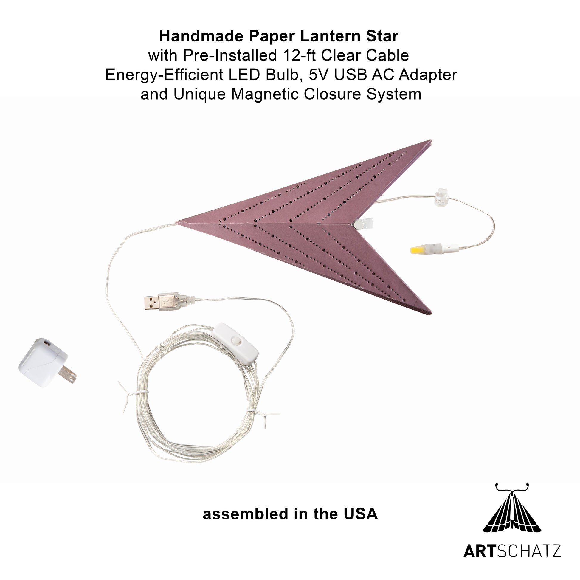 Each Star is handmade in India and assembled here in New York, USA. Each star has been checked for quality and comes pre-wired with a clear 12-ft cable with on/off switch, an energy saving LED bulb and a 5V AC adapter.