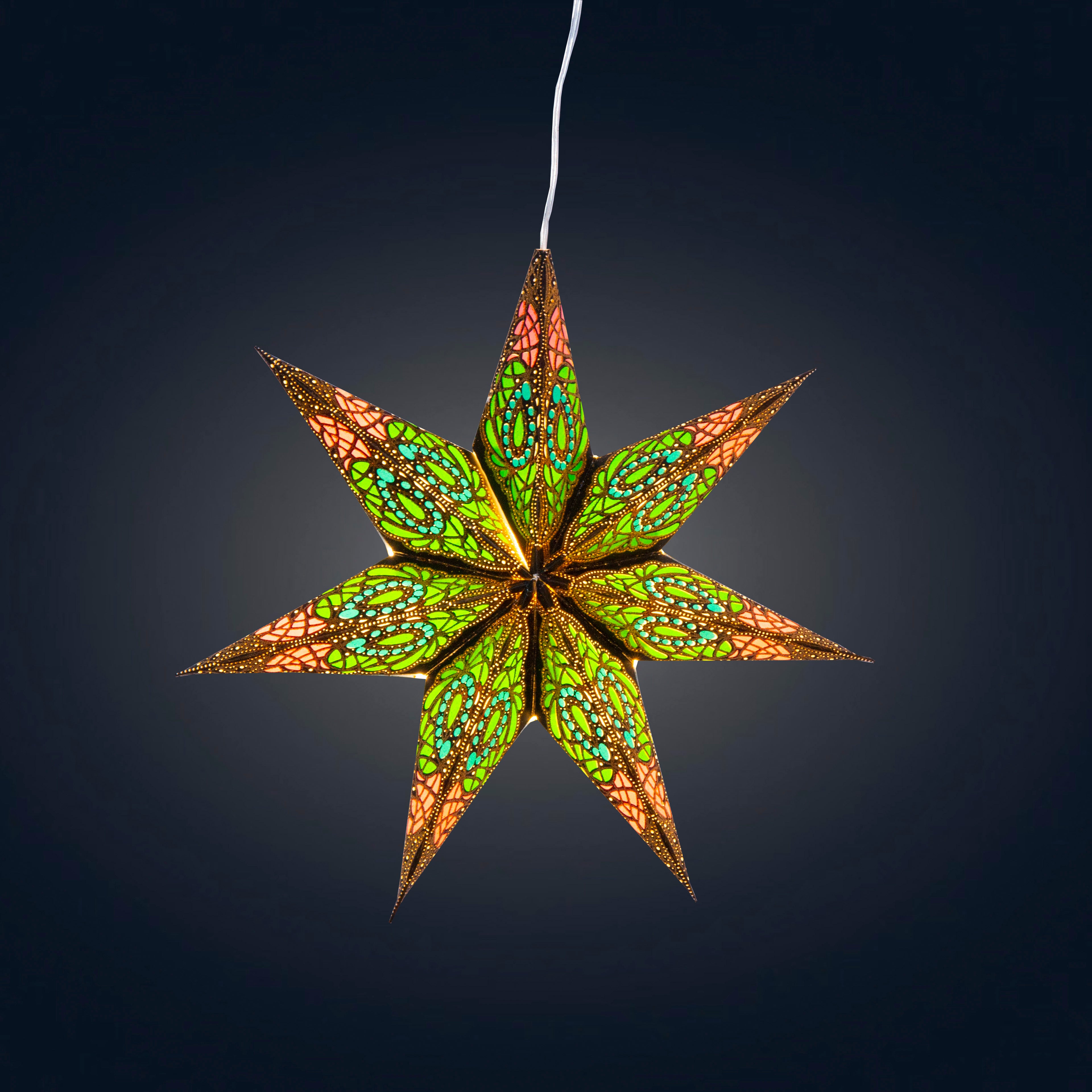 Each handmade paper star comes with a pre-installed clear 12-ft cable, an energy saving LED bulb and a 5V AC Adapter a unique magnetic closure and optional battery powered as add-on with a 5V USB Battery Pack.