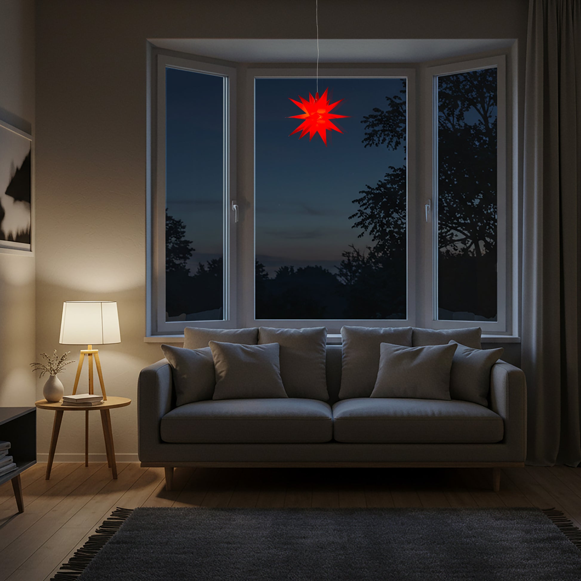 Our pre-installed cable comes out of the point of the star ensuring that the star is hung properly and quickly ready for use. All other stars you see on the market have the cable coming out of the closing seam, causing the star to hang tip pointing down.