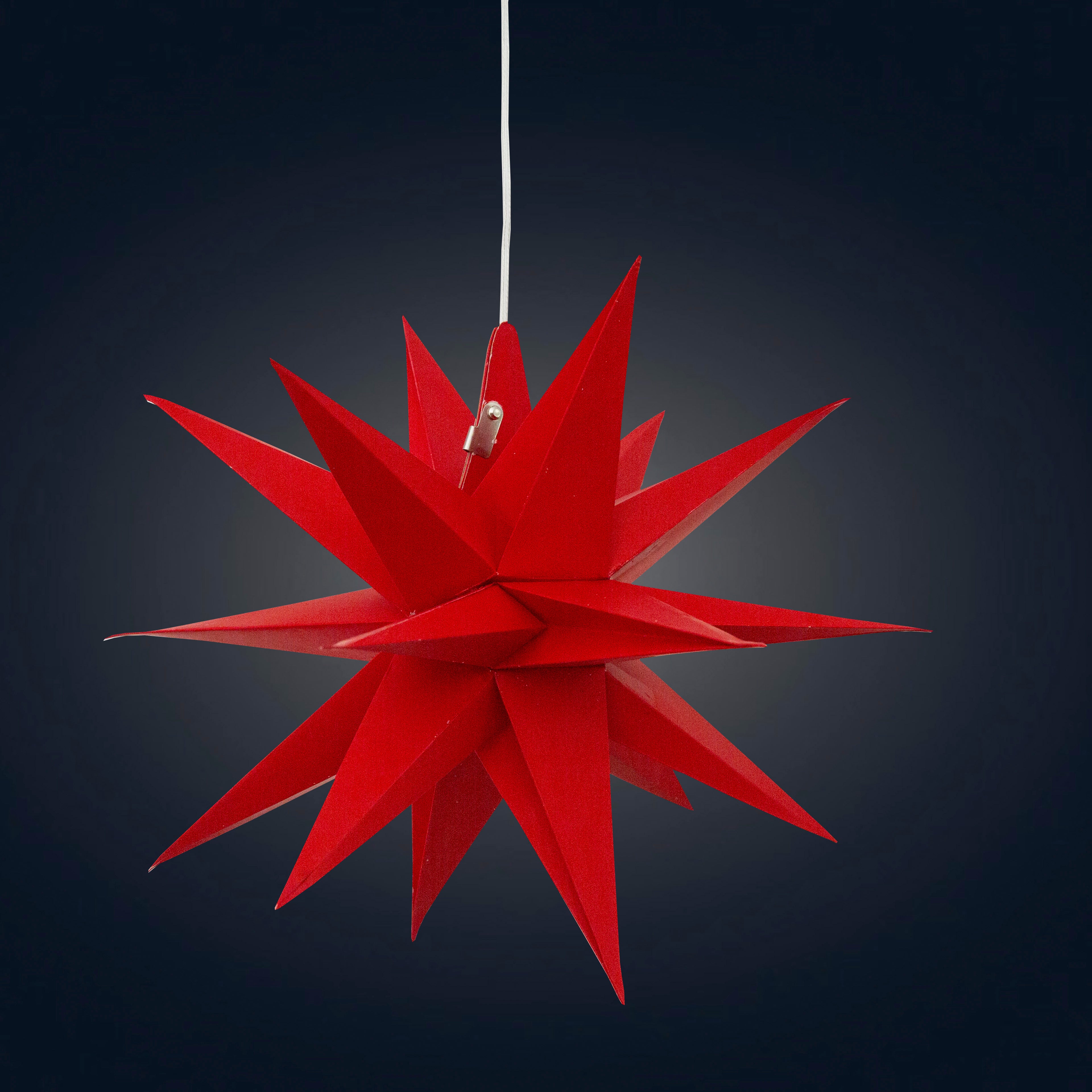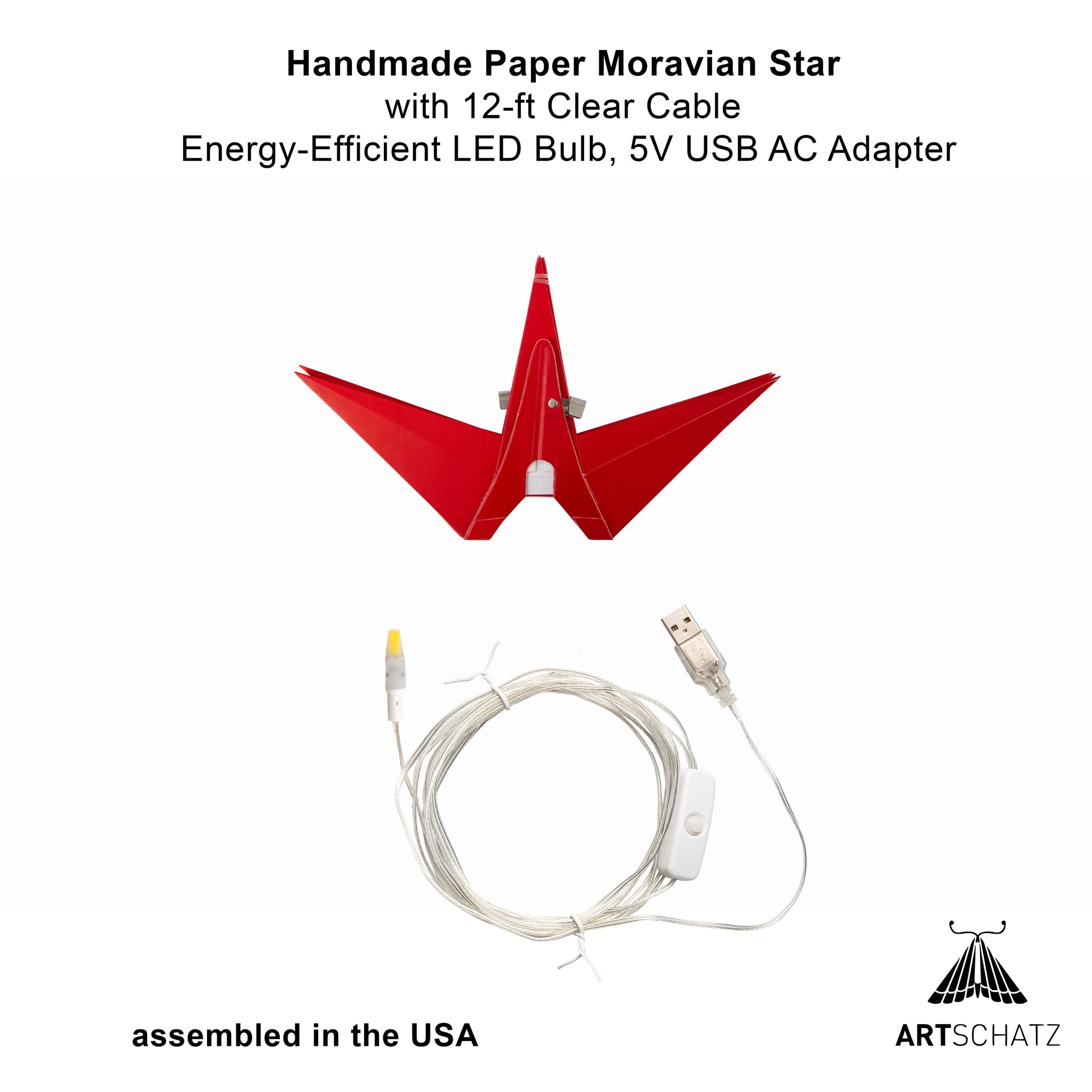 Each handmade moravian paper star comes with a clear 12-ft cable, an energy saving LED bulb and a 5V AC Adapter.