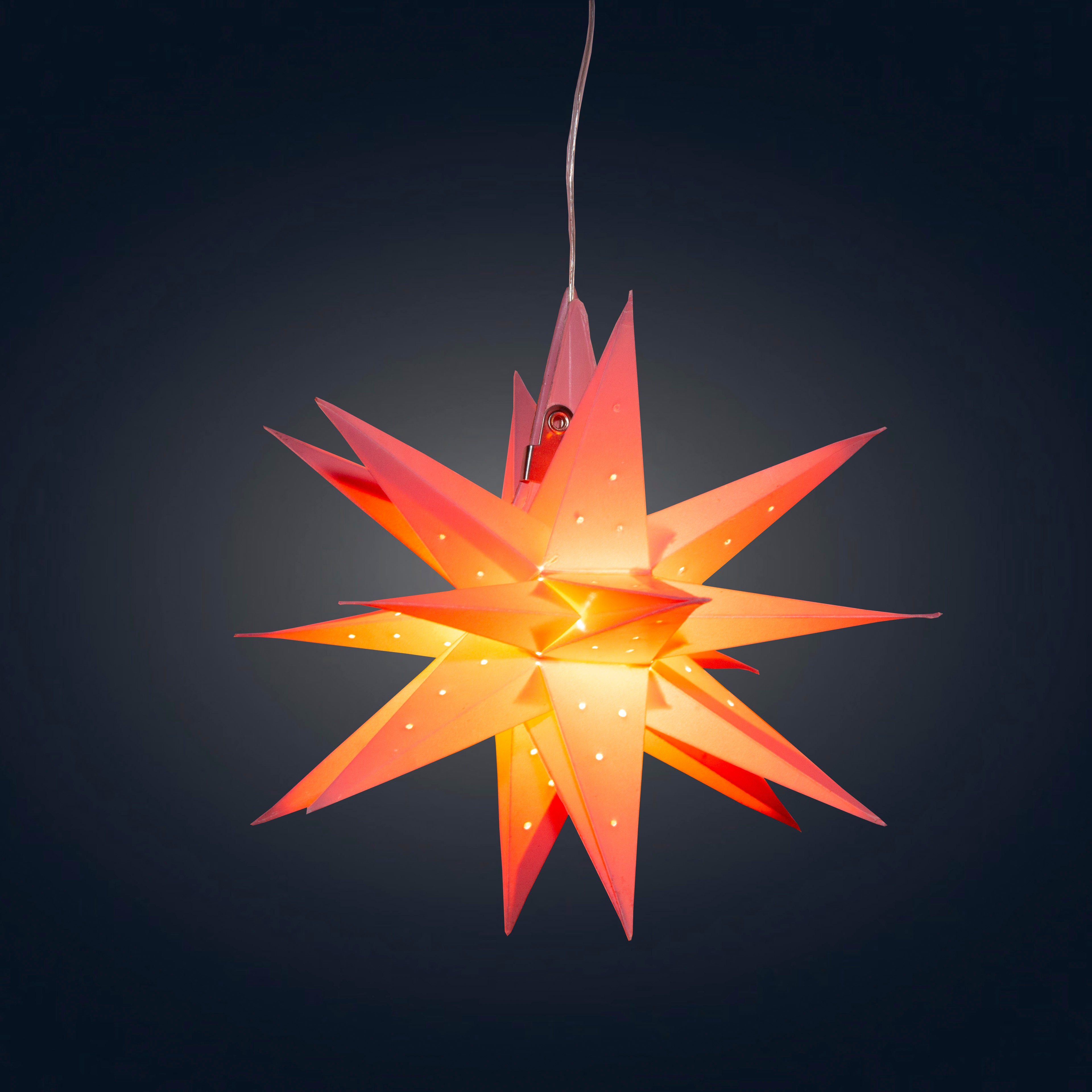 Each handmade moravian paper star comes with a clear 12-ft cable, an energy saving LED bulb and a 5V AC Adapter, optional as add-on with a 5V USB Battery Pack.