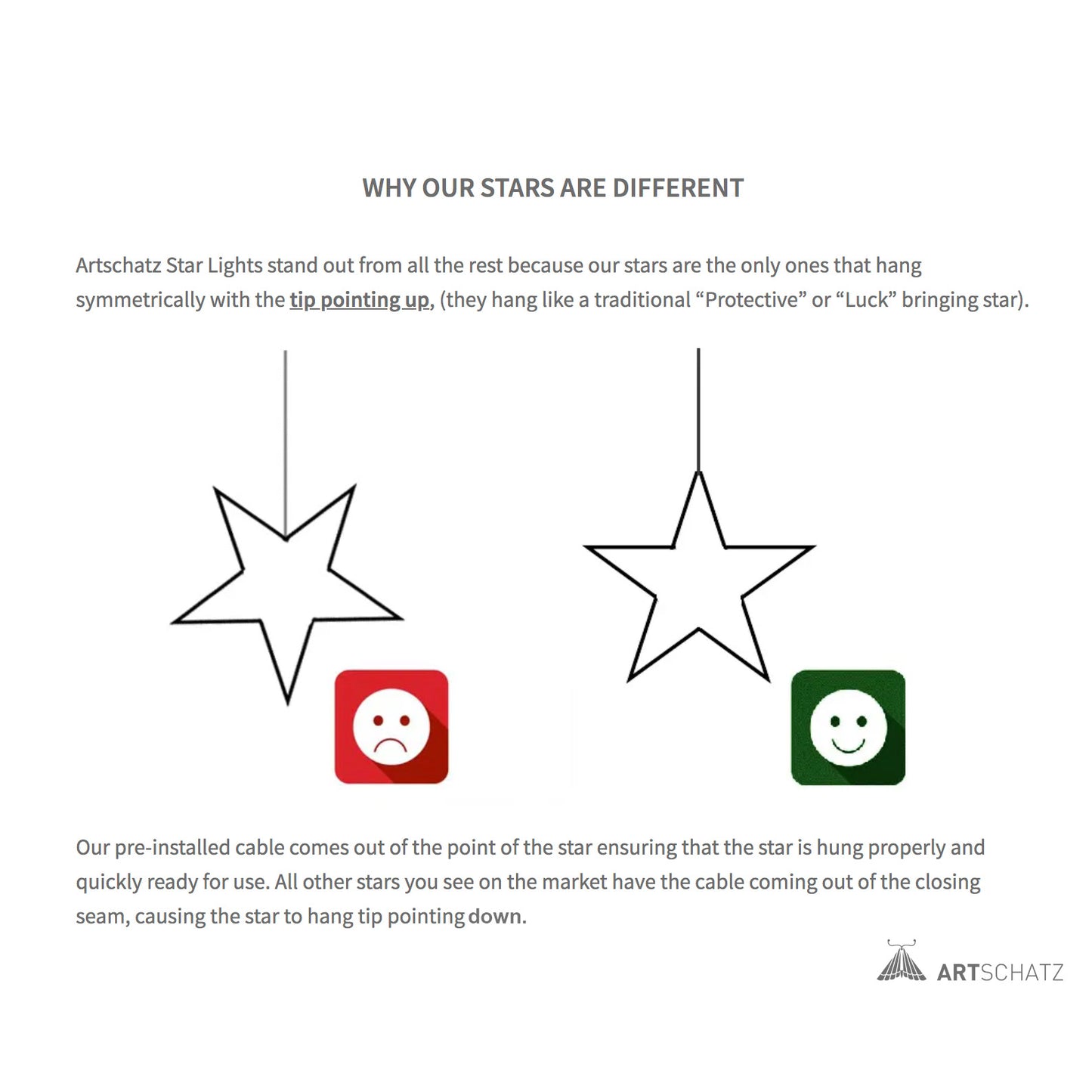 Artschatz Star Lights stand out from all the rest because our stars are the only ones that hang symmetrically with the tip pointing up, (they hang like a traditional “Protective” or “Luck” bringing star).