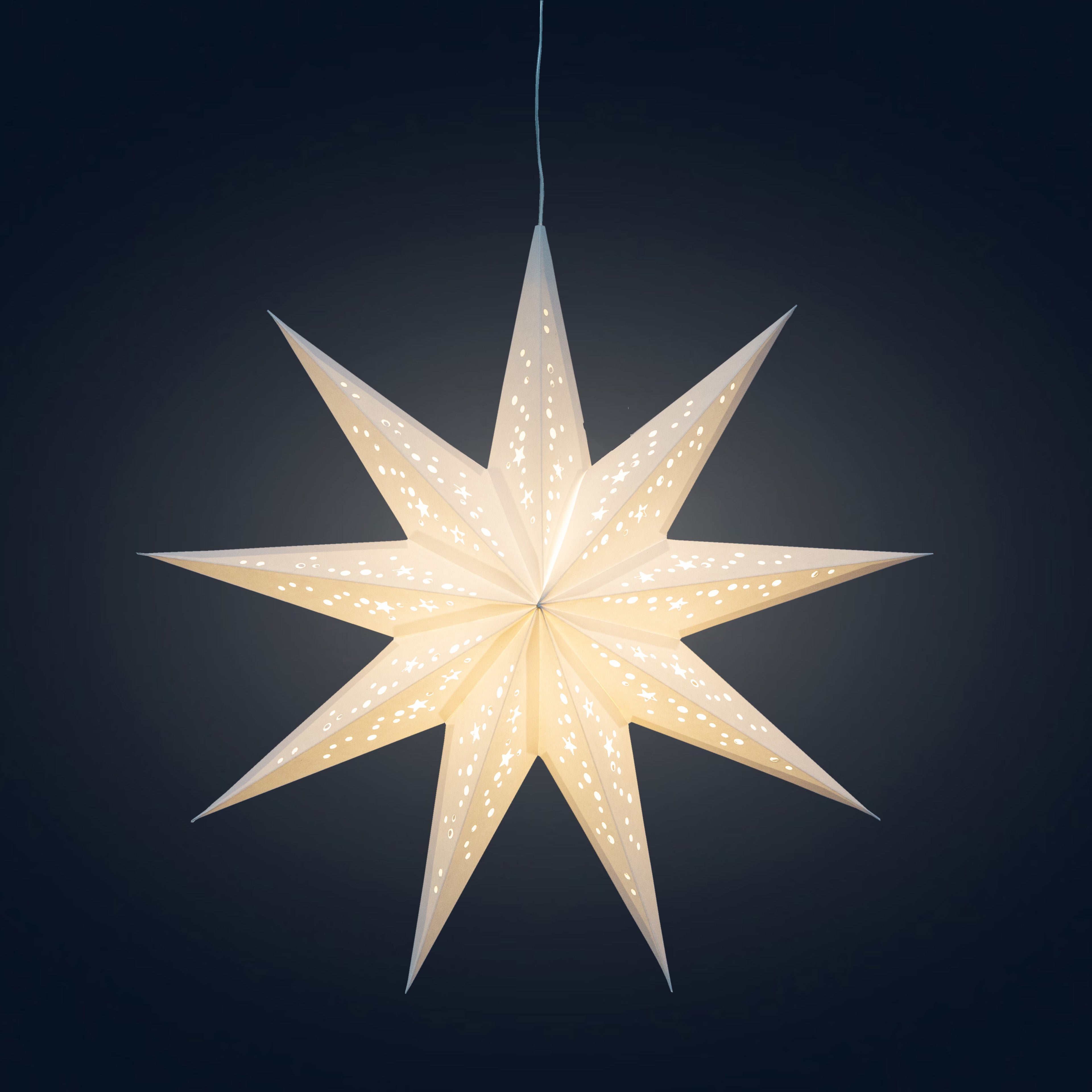 Our pre-installed cable comes out of the point of the star ensuring that the star is hung properly and quickly ready for use. All other stars you see on the market have the cable coming out of the closing seam, causing the star to hang tip pointing down.
